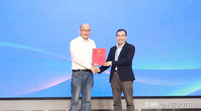 陳曄光為馬帥頒發(fā)人工智能學(xué)院院長聘書。
