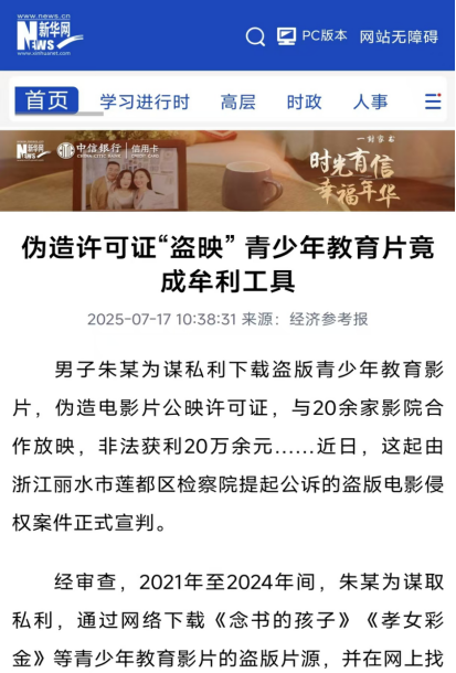 據(jù)參考消息報(bào)披露,經(jīng)法院審理查明,2021 年 3 月至 2024 年 3 月期間,被告人朱某為謀取私利,通過(guò)網(wǎng)絡(luò)下載《孝女彩金》《念書的孩子》等多部青少年教育影片的盜版片源,篡改影片片名和片頭,偽造電影片公映許可證及虛構(gòu)主體的授權(quán)書,與浙江臺(tái)州、麗水、溫州、嘉興等地 20 余家影院合作,采用場(chǎng)地租賃或票房五五分賬的模式,在影院放映盜版影片,并印制大量宣傳單和優(yōu)惠券,假冒影院名義在幼兒園、小學(xué)周邊以 “教育專場(chǎng)”“公益放映” 等名義宣傳售票,誤導(dǎo)家長(zhǎng)帶孩子觀影,非法經(jīng)營(yíng)數(shù)額達(dá) 46 萬(wàn)余元,非法獲利 20 萬(wàn)余元。