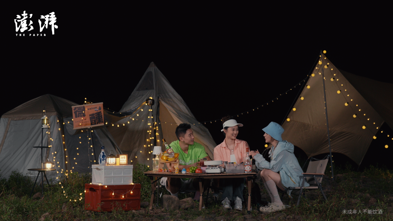 這是當下年輕人們十分熟悉的場景,也是他們逃離壓力、告別工作與生活擁抱的方式。夜晚來臨,三人圍坐在一起,白天的疲累轉(zhuǎn)化成慵懶,陌生感也逐漸減少,此時的晴果神神秘秘地從包里掏出來了一個搖酒壺,拿著汾酒、話梅、茶飲、水果等食材,開始給露營的伙伴們調(diào)起了雞尾酒。