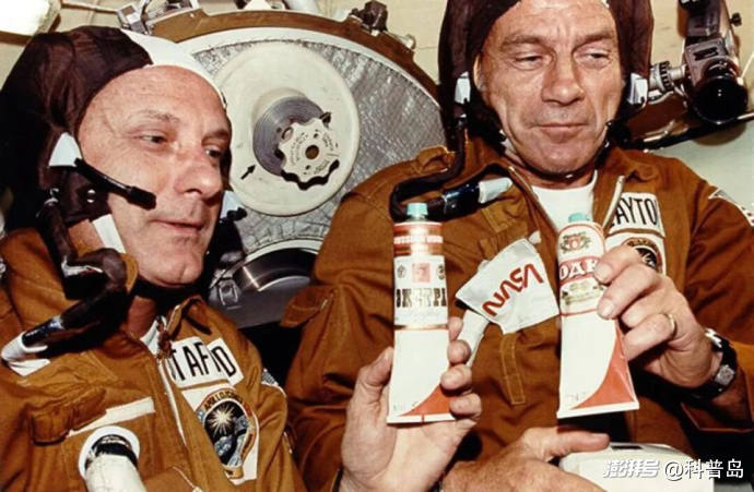 美國阿波羅飛船與原蘇聯(lián)聯(lián)盟號飛船在太空對接后,美國航天員進入聯(lián)盟號飛船座艙,品嘗“牙膏式”食品 圖片來源:NASA