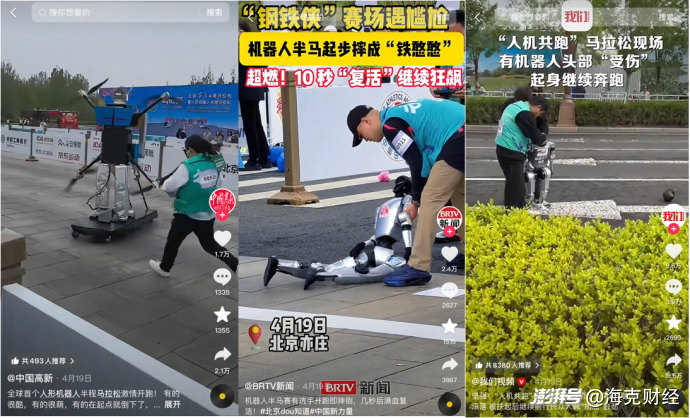 被很多網(wǎng)友揶揄的北京亦莊機器人馬拉松賽事即是一例。2025年4月,該人形機器人馬拉松賽事聚集了知名機器人及智能制造生態(tài)企業(yè)超過300家,參賽機器人需要工程師團隊全程跟隨,負責更換電池、處理失衡等突發(fā)狀況。比賽視頻顯示,有的機器人跑著跑著平地摔倒;有的機器人顫顫巍巍,走不出直線;有的機器人甚至直接把頭部摔掉了。