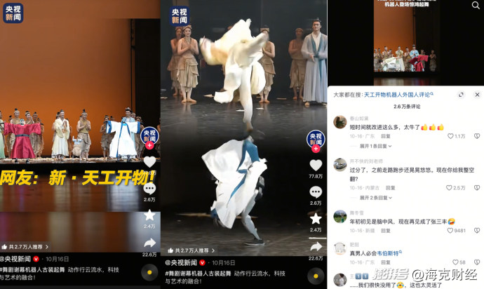 機器人表演就頗為顯眼。在2025年1月的央視春晚上,宇樹科技機器人H1表演的《秧Bot》僅是根據(jù)節(jié)奏扭動身體和轉(zhuǎn)動手帕,動作相對簡單。到了2025年10月,在舞劇《天工開物》的謝幕環(huán)節(jié)中,宇樹科技機器人已能精準復(fù)現(xiàn)舞者姿態(tài),以流暢的側(cè)翻、后空翻等完成“人機共舞”。