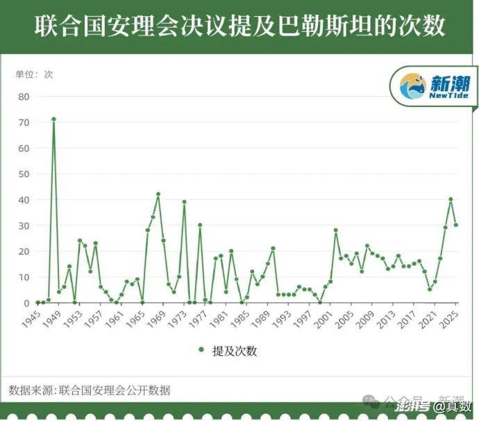 1947年,《貝福爾宣言》一經(jīng)發(fā)表,巴勒斯坦就成為了聯(lián)合國安理會(huì)繞不開的議題。七十多年間,聯(lián)合國安理會(huì)決議中,共提及巴勒斯坦1044次,且呈現(xiàn)出巨大的波動(dòng)性。