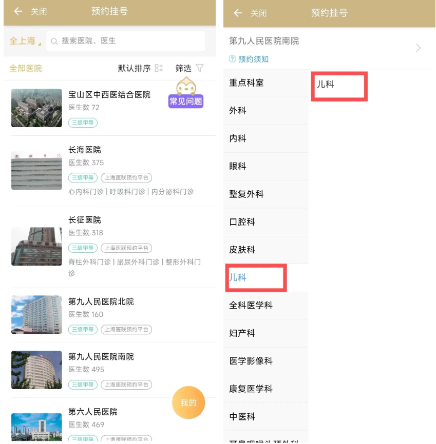 第二步:搜索想去的醫(yī)院,也可按條件進(jìn)行篩選(按距離、醫(yī)院等級(jí)篩選),隨后點(diǎn)擊進(jìn)入科室頁(yè)面選擇目標(biāo)科室。