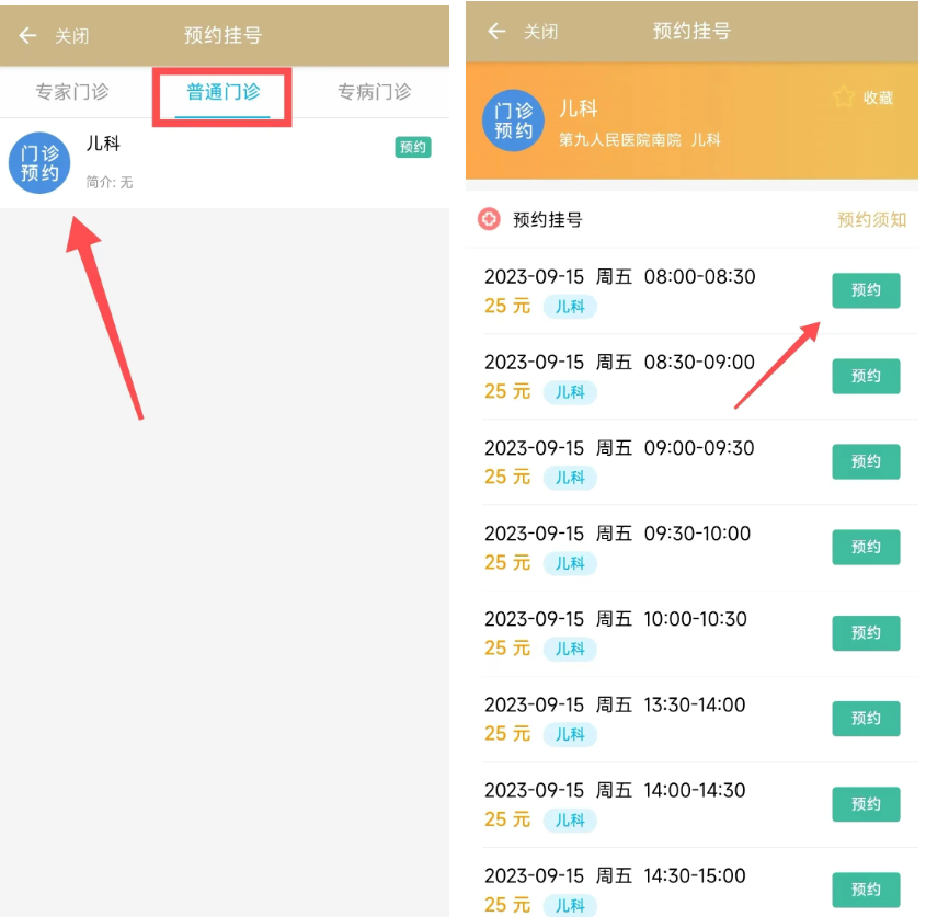 第三步:可選擇專家門診、普通門診、專病門診,這里我們以選擇普通門診為例,選擇合適的時(shí)間段點(diǎn)擊“預(yù)約”。