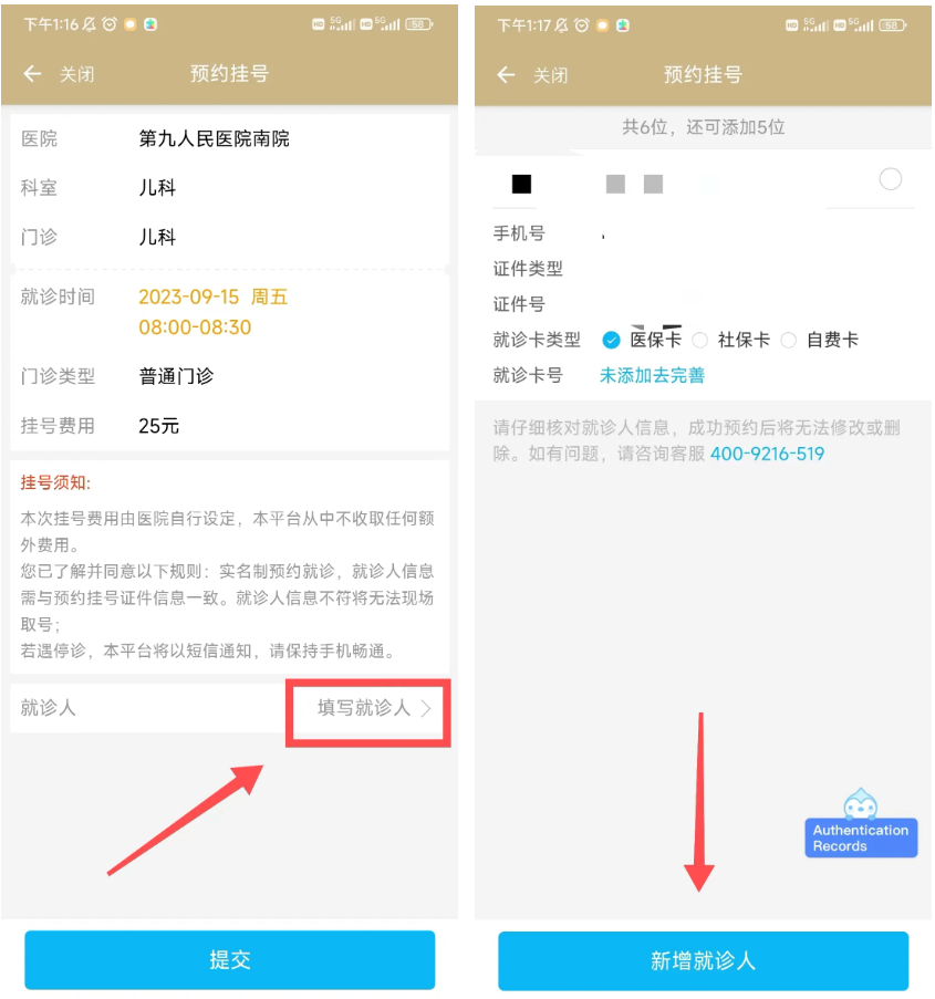 第五步:填寫完就診人信息,請(qǐng)點(diǎn)擊“提交”(可選擇證件號(hào)或就診卡進(jìn)行預(yù)約),輸入收到的手機(jī)驗(yàn)證碼即可。