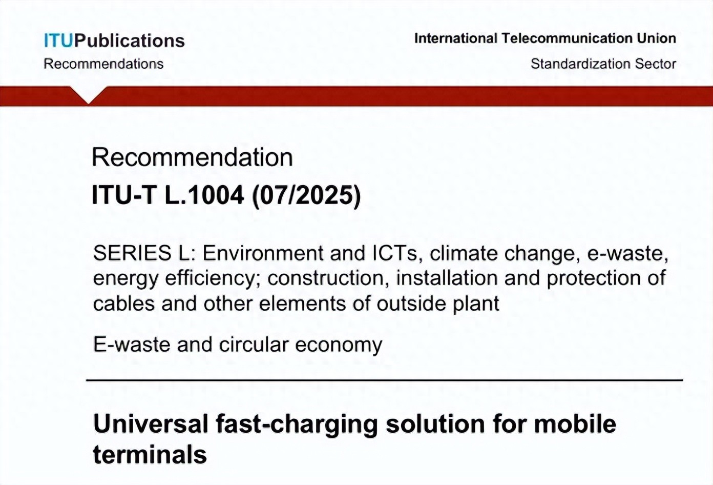 近期,由中國信息通信研究院牽頭,聯(lián)合華為、OPPO、vivo 公司撰寫的標(biāo)準(zhǔn) L.1004《移動(dòng)終端通用快速充電解決方案》(ITU—T L.1004, Universal fast-charging solution for mobile terminals)通過國際電信聯(lián)盟電信標(biāo)準(zhǔn)化部門第五研究組(ITU-T SG5)審議并作為國際標(biāo)準(zhǔn)正式發(fā)布。