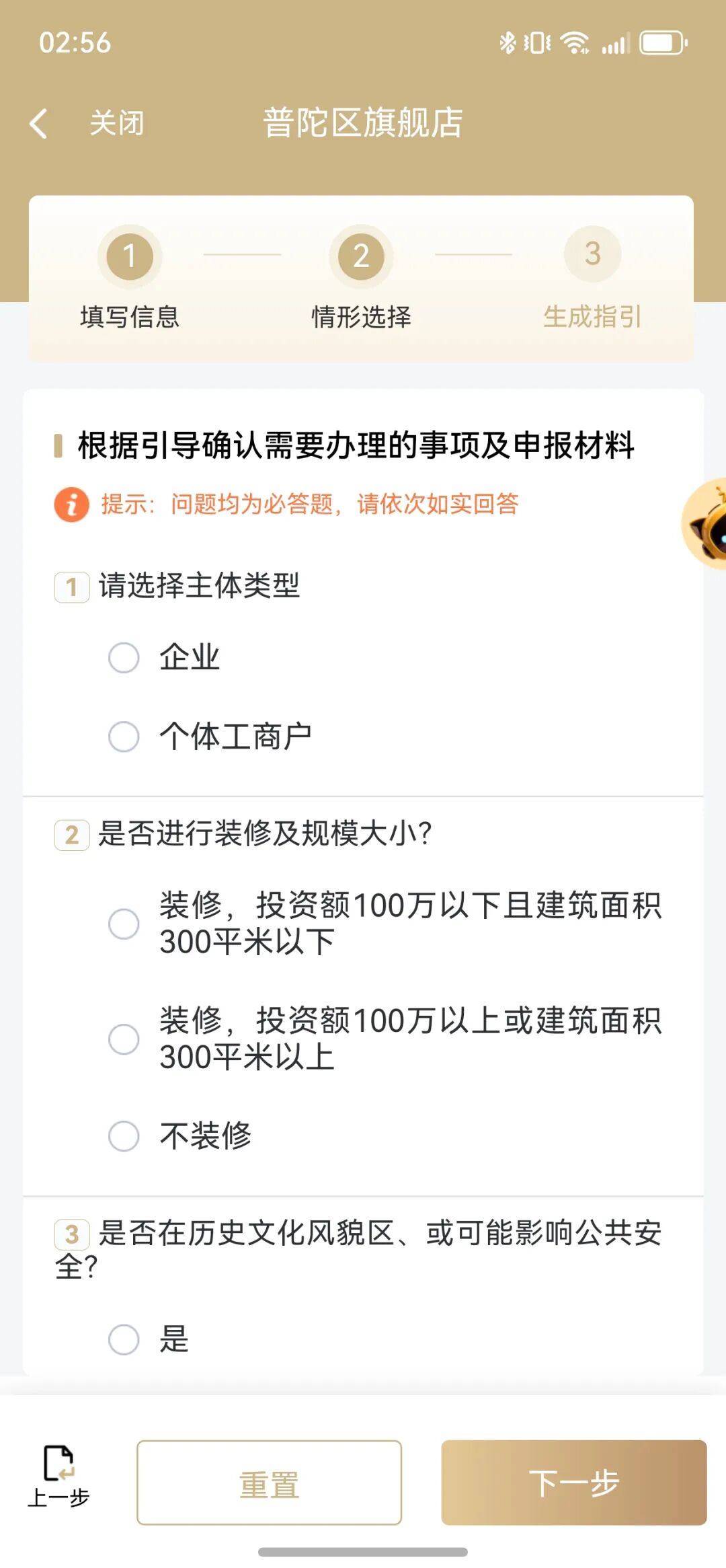 第二步情形選擇:根據(jù)引導確認需要辦理的事項及申報材料,填寫完畢點擊下一步。