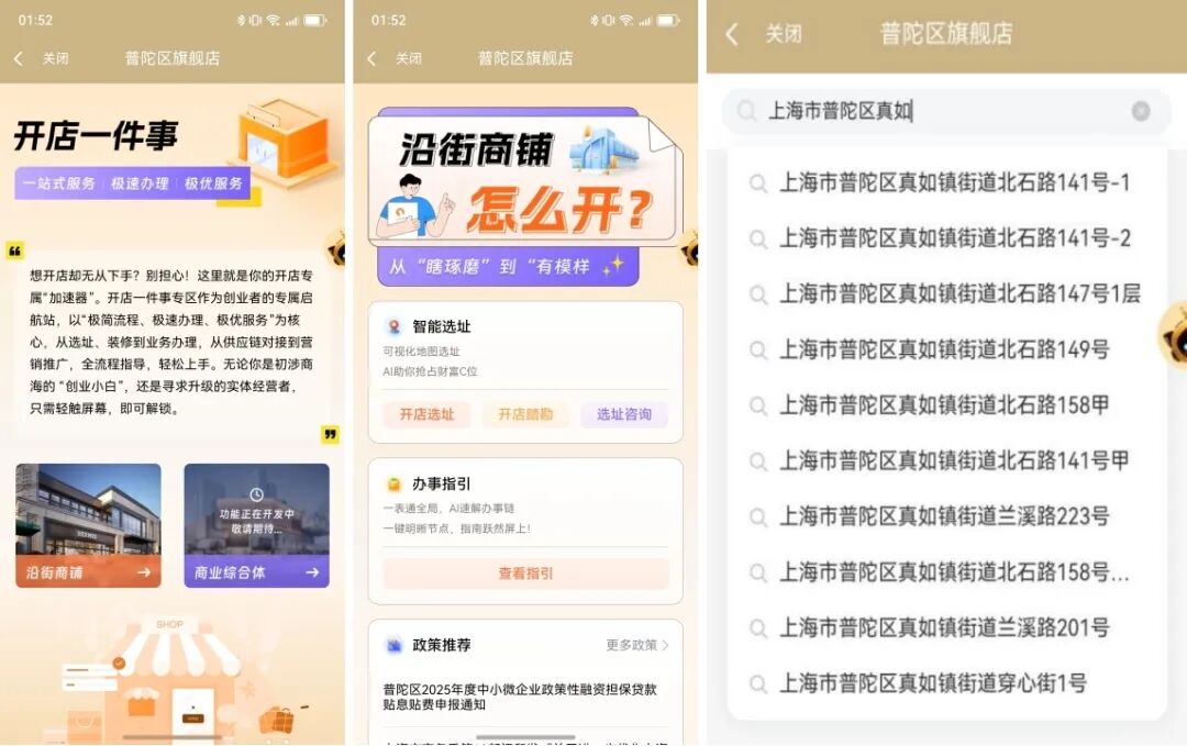 隨申辦APP上的普陀旗艦店“開店一件事”專區(qū)就是沖著這些痛點來的!它定位為創(chuàng)業(yè)者的全周期數(shù)字助手,不管你是想開便利店、餐飲店還是美容美發(fā)店,這里都能提供從選址到開業(yè)的一站式服務。