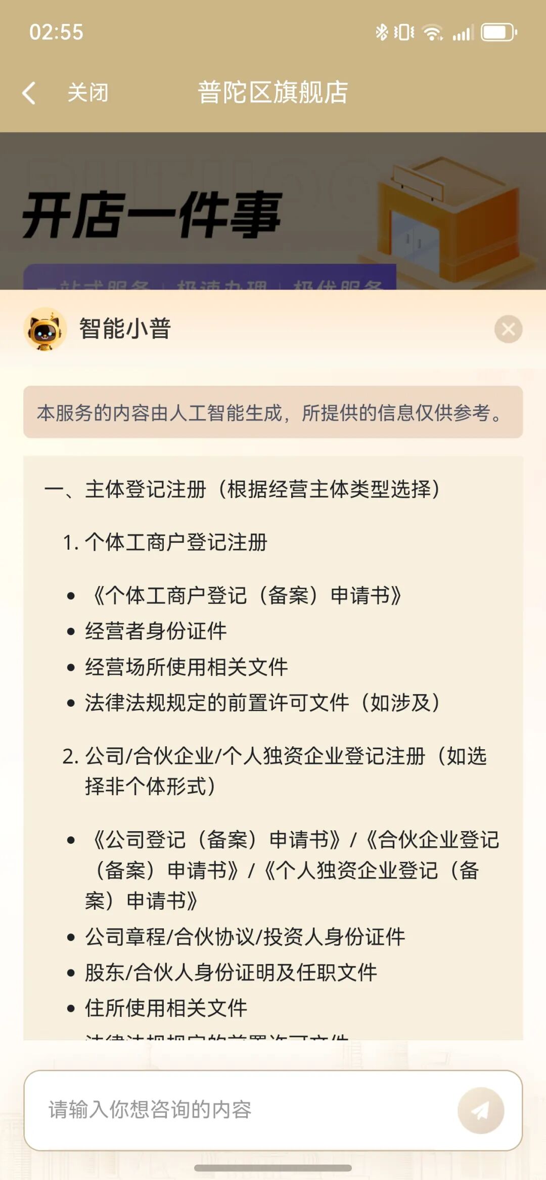 不同行業(yè)、不同規(guī)模的店鋪,辦理流程千差萬別。詢問專區(qū)的智能小普能根據(jù)你咨詢的情況,秒級生成開店問題解答。比如開便利店和開火鍋店,需要的許可證明完全不同,智能小普會區(qū)分兩者區(qū)別給予提示,避免你走彎路。
