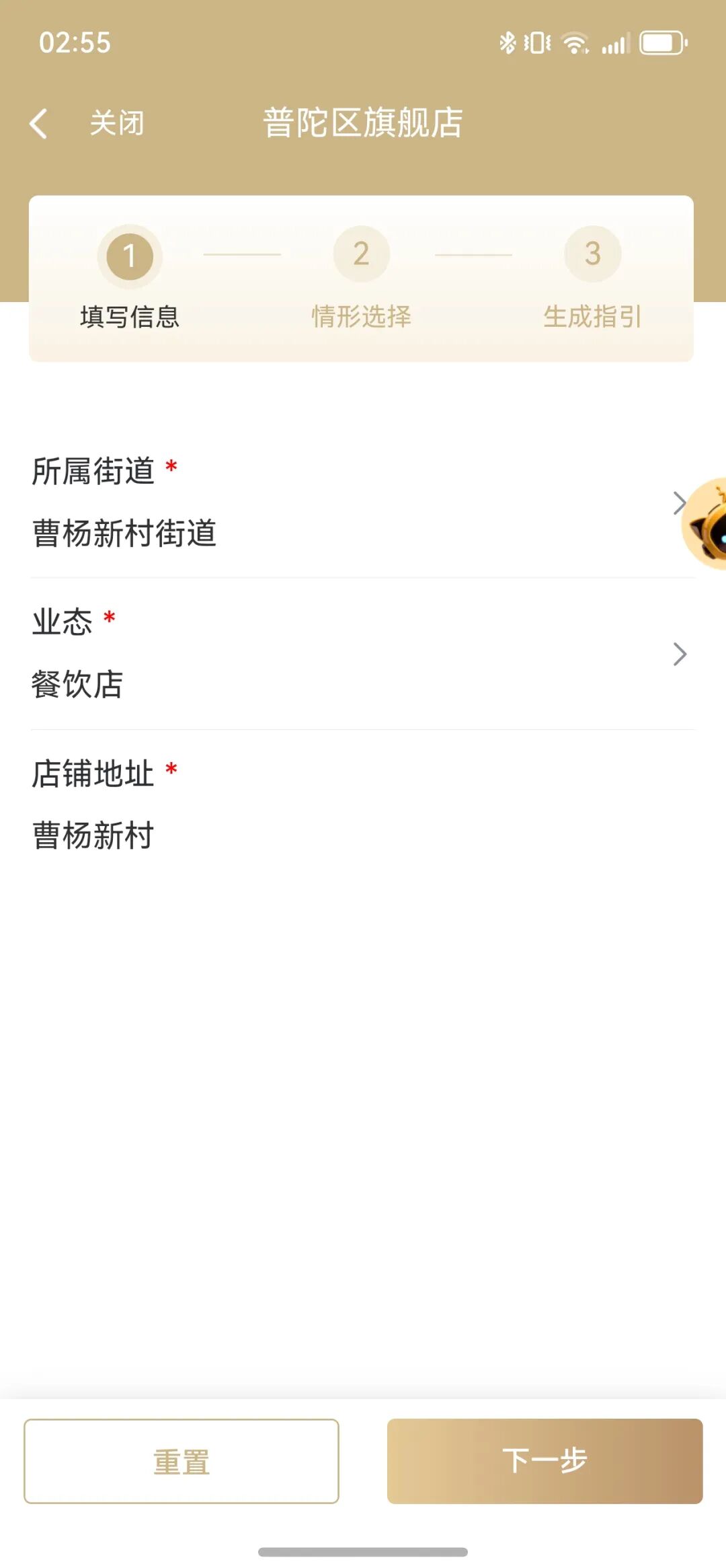 第一步填寫信息:填寫所屬街道、業(yè)態(tài)、店鋪地址,點擊下一步