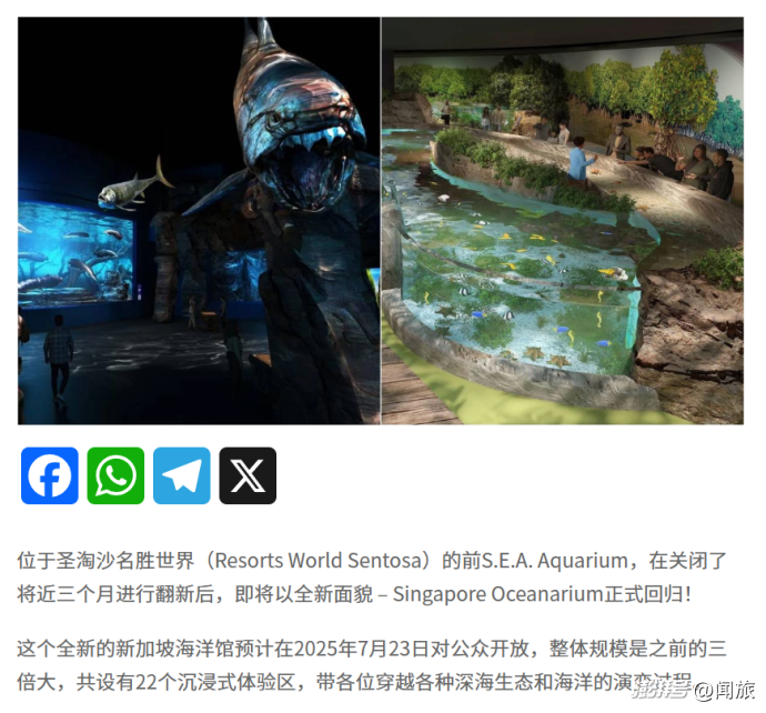 今年7月正式對外開放的新加坡海洋生態(tài)館由備受歡迎的S.E.A.海洋館升級擴建而成,將沉浸式敘事與前沿互動科技相融合。觀景焦點“廣闊海洋”展區(qū)設(shè)36米寬的觀景窗,讓游客可近距離觀看蝠鲼與斑馬鯊在水中穿梭的姿態(tài),是全館最能讓人靜下來的區(qū)域。