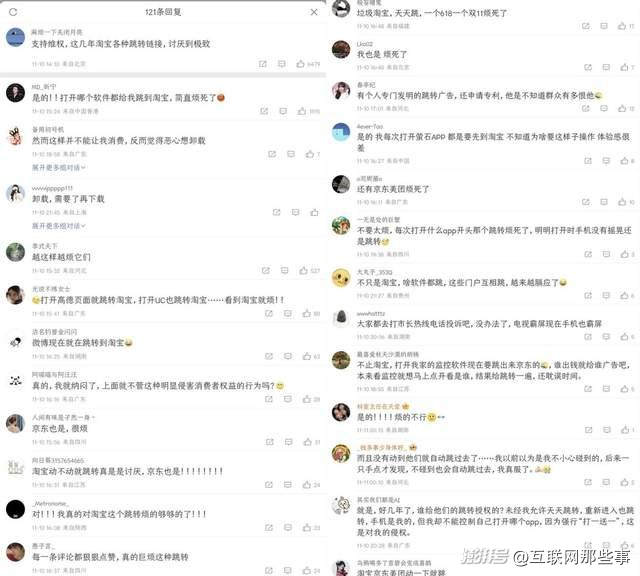 值得一提的是,在劉嘉玲微博的評論區(qū),還有多條熱評及跟評指向“各種跳轉(zhuǎn)鏈接,討厭到極致”、“離譜,每打開一個app就強行跳到淘寶,煩死了,這廣告”、“京東也是”等現(xiàn)象,引發(fā)了大量網(wǎng)友的共鳴…