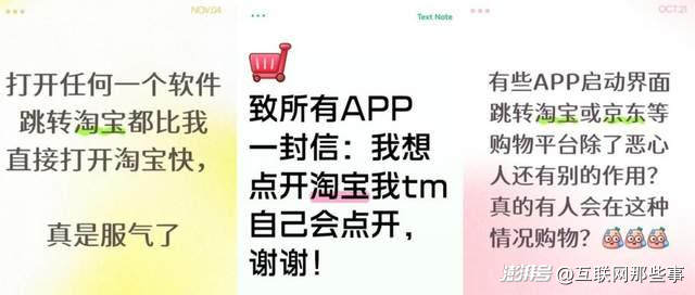 比如小紅書平臺上,就不乏調(diào)侃,甚至有網(wǎng)友給所有APP一封信:“我想點開我**自會點開,謝謝!”,“有些APP啟動界面跳轉(zhuǎn)淘寶或京東等購物平臺除了惡心人還有別的作用?……”