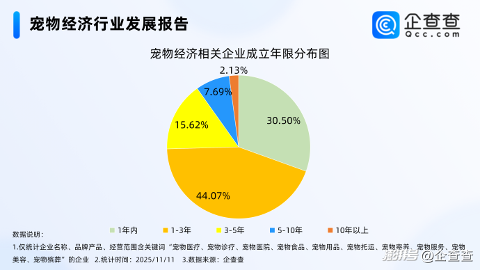 企查查數(shù)據(jù)顯示,國內(nèi)現(xiàn)存寵物經(jīng)濟(jì)相關(guān)企業(yè)498.33萬家。從經(jīng)營時間來看,寵物經(jīng)濟(jì)相關(guān)企業(yè)多成立于近三年,成立年限在1-3年的相關(guān)企業(yè)最多,占比44.07%。其次,成立年限在1年內(nèi)的相關(guān)企業(yè)占比30.50%。注冊量方面,2024年全年注冊165.18萬家,截至目前,今年已注冊139.99萬家。