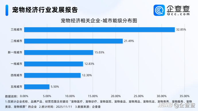 企查查數(shù)據(jù)顯示,從城市能級分布來看,寵物經(jīng)濟(jì)相關(guān)企業(yè)多分布在三線城市,占比達(dá)32.85%。其次,分布在二線城市、新一線城市的寵物經(jīng)濟(jì)相關(guān)企業(yè)分別占比21.49%、15.03%。