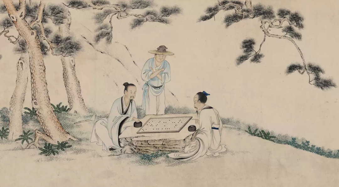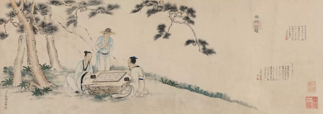 清代丁觀鵬《爛柯仙跡圖》(局部)24.5×54.5cm著錄:《石渠寶笈》三編《秘殿珠林石渠寶笈匯編》第9卷王質(zhì)悄沒聲兒溜過去一看可就走不動道兒了!這棋局真是龍爭虎斗,變化無窮,他是越看越入迷,把斧頭往地上一擱,早把砍柴的事兒忘到九霄云外去了。