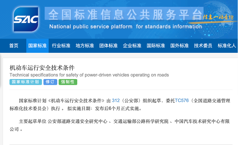 11月12日,據全國標準信息公共服務平臺官網,公安部組織起草的國家標準計劃《機動車運行安全技術條件》向社會征求意見。該標準主要起草單位有公安部道路交通安全研究中心、交通運輸部公路科學研究院、中國汽車技術研究中心有限公司,擬在征求意見稿發(fā)布后6個月正式實施,替代現行的GB 7258。