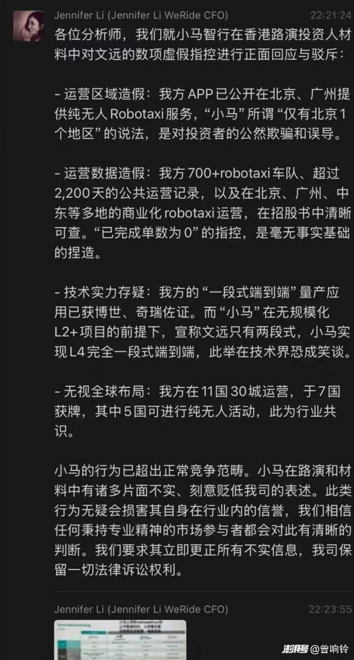 假設以這個視角審視其他行業(yè),道理大致如此。典型的案例是近期小馬智行與文遠知行的互撕。10月30日晚,文遠知行CFO李璇一紙公開聲明,直指小馬智行路演材料“數(shù)據(jù)造假、刻意貶低對手”,兩家都是L4自動駕駛行業(yè)的公司,背景大致相同,商業(yè)模式和矩陣有一定差距,均處于IPO的關(guān)鍵階段,因此這場喧囂的被外界不少人視為爭奪資本的關(guān)注的事件。