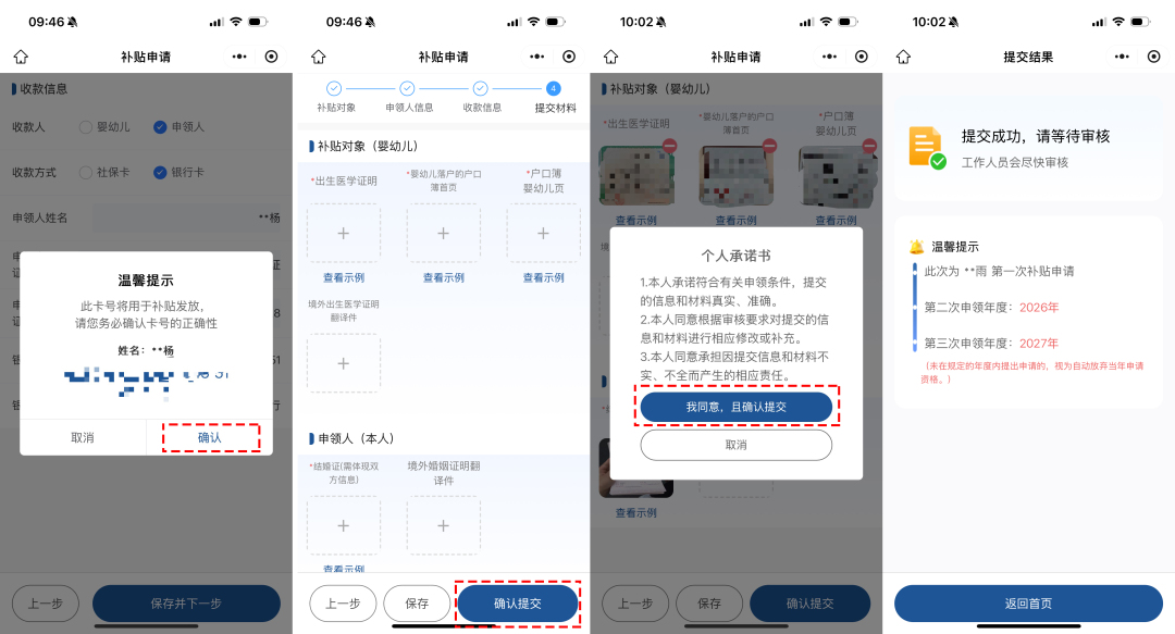 填寫信息包括:提供嬰幼兒的出生醫(yī)學(xué)證明、居民戶口簿、婚姻證明、補(bǔ)貼收款信息等材料,并對(duì)所提供信息及材料的真實(shí)性、完整性做出承諾→點(diǎn)擊“確認(rèn)提交”后,耐心等待審核結(jié)果即可。