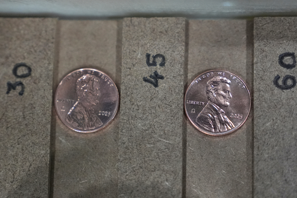 當地時間2025年11月12日,費城,美國鑄幣局展示了最后鑄造的五枚一美分硬幣中的兩枚。視覺中國 圖