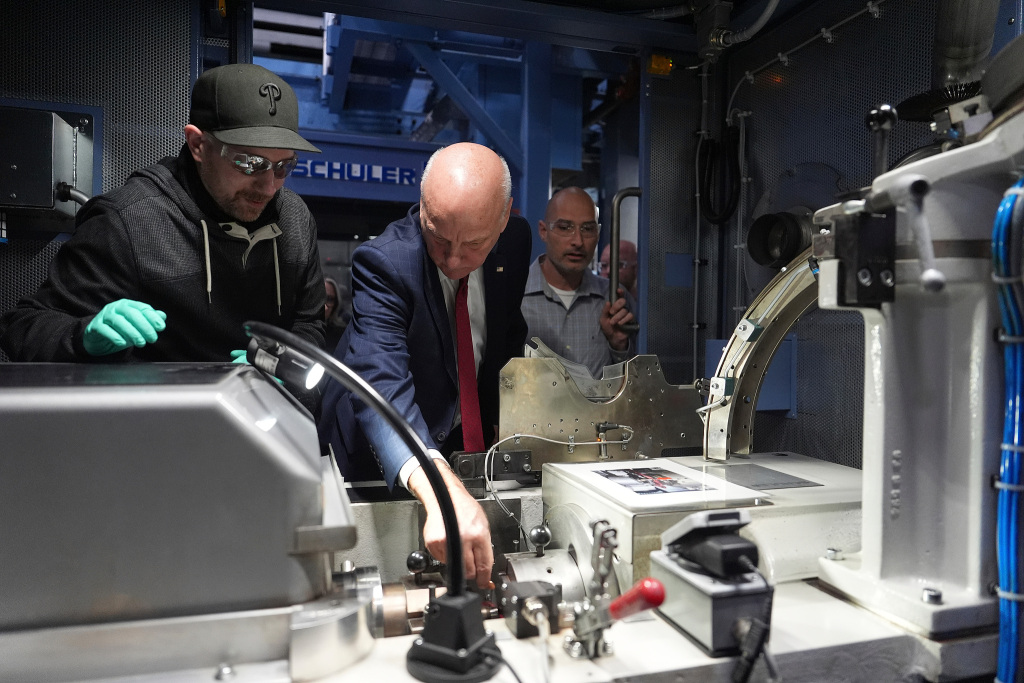 當地時間2025年11月12日,費城,美國財政部長Brandon Beach在鑄幣局工人協助下,將一枚空白硬幣裝入鑄幣機。視覺中國 圖