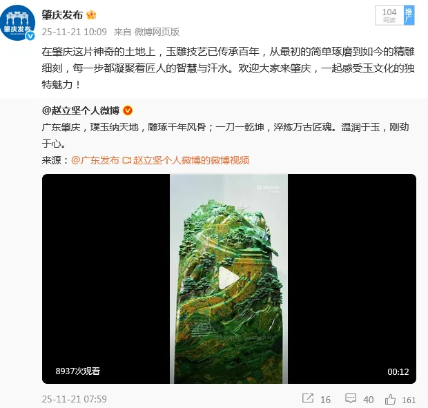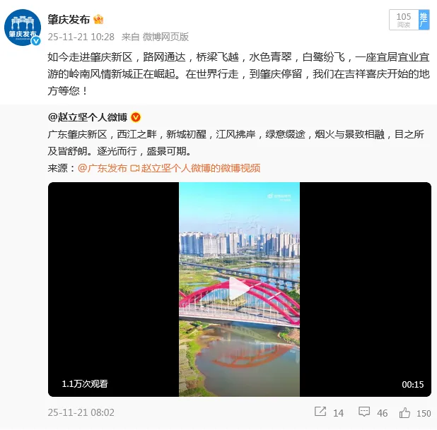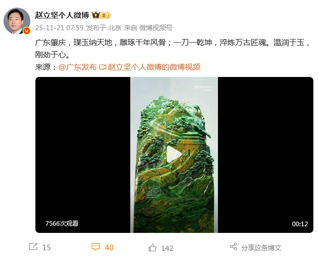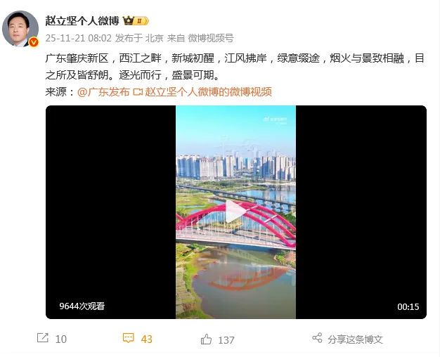 11月21日上午,外交部邊界與海洋事務(wù)司副司長(zhǎng)趙立堅(jiān)的個(gè)人微博,發(fā)布兩條來源為“廣東發(fā)布”視頻號(hào)的作品,點(diǎn)贊肇慶廣寧廣綠玉以及肇慶新區(qū)美景。