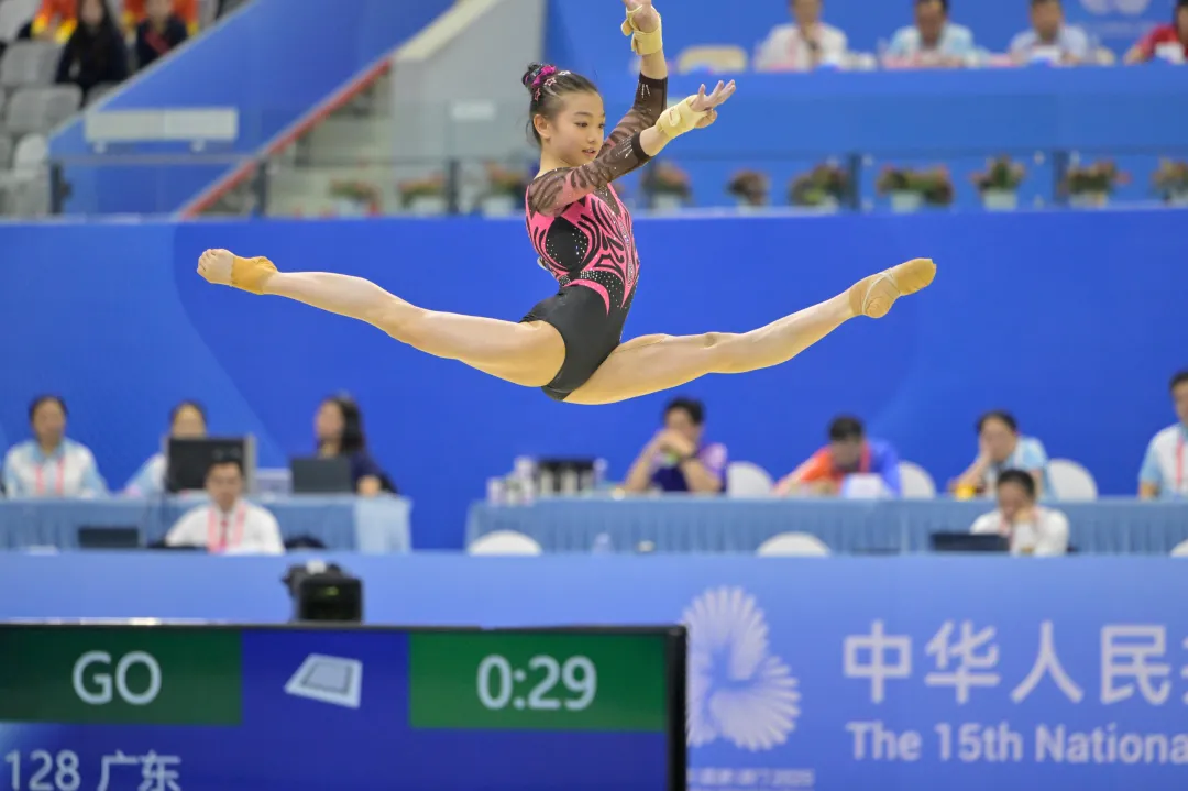△廣東隊(duì)柯沁沁在肇慶新區(qū)體育中心體育館進(jìn)行自由體操比賽。肇慶市融媒體中心記者 吳勇強(qiáng) 攝