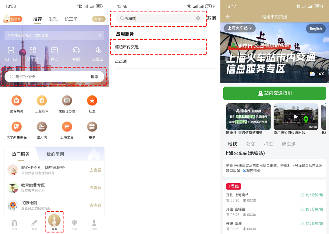 登錄“隨申辦市民云”APP→首頁搜索框中輸入關鍵字“樞紐站”→點擊“樞紐市內交通”進入服務頁面即可體驗 。