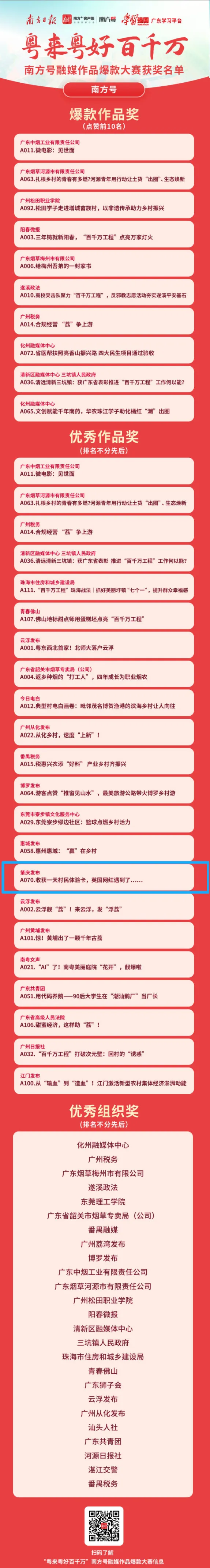 由南方日報、南方+客戶端聯(lián)合“學(xué)習(xí)強(qiáng)國”廣東學(xué)習(xí)平臺共同發(fā)起的“粵來粵好百千萬”南方號融媒作品大賽,今日正式公布獲獎結(jié)果。大賽累計收到3641件參賽作品,共評選出195個獎項,作品涵蓋民生服務(wù)、鄉(xiāng)村振興、產(chǎn)業(yè)發(fā)展、文化傳承等“百縣千鎮(zhèn)萬村高質(zhì)量發(fā)展工程”的多個領(lǐng)域,生動呈現(xiàn)了廣東實施“百千萬工程”以來所取得的豐碩成果。大賽吸引了大批南方號、融媒創(chuàng)作者及南方+拍客群體踴躍參與,累計實現(xiàn)全網(wǎng)流量近億。