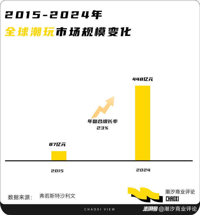 弗若斯特沙利文數(shù)據(jù)顯示,2015年至2024年,全球潮玩市場規(guī)模從87億元增長至448億元,年復(fù)合增速接近23%。在這個快速擴(kuò)張的市場中,中國潮玩品牌憑借其獨(dú)特的系統(tǒng)優(yōu)勢,正在書寫屬于自己的全球化故事。