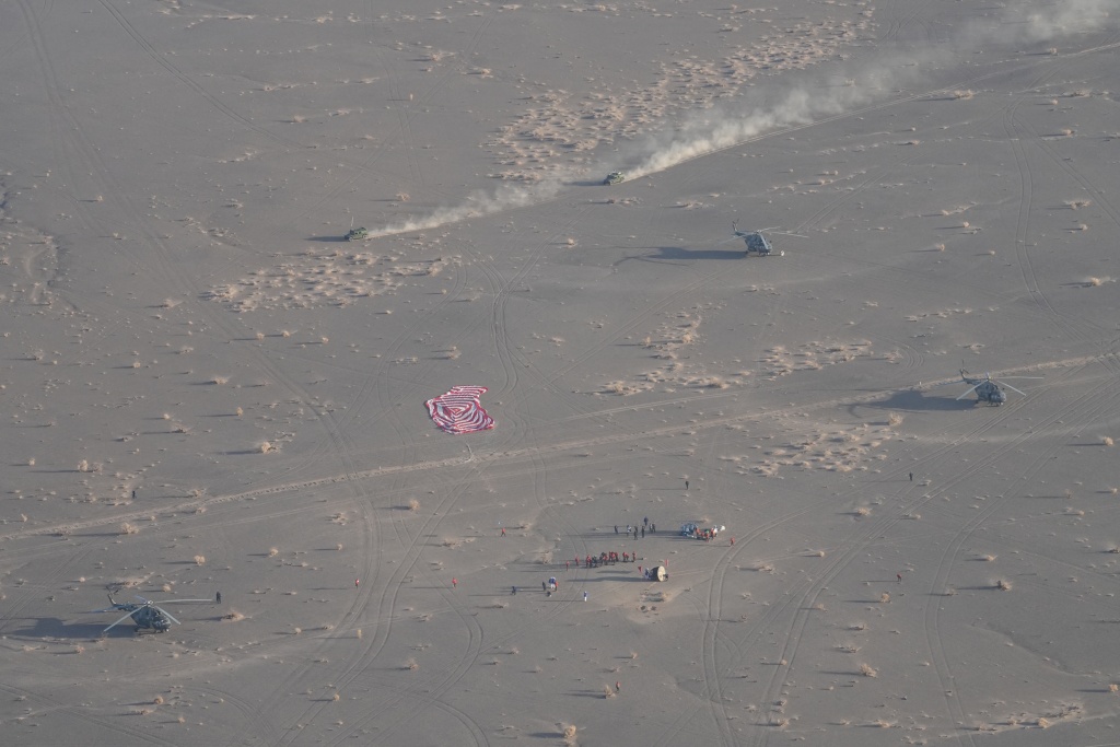 11月14日,載著神舟二十號(hào)航天員乘組的神舟二十一號(hào)載人飛船返回艙在東風(fēng)著陸場(chǎng)成功著陸。新華社記者 李志鵬 攝