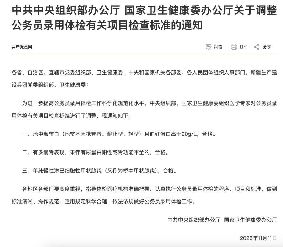 共產(chǎn)黨員網(wǎng)11月14日發(fā)布《中共中央組織部辦公廳 國(guó)家衛(wèi)生健康委辦公廳關(guān)于調(diào)整公務(wù)員錄用體檢有關(guān)項(xiàng)目檢查標(biāo)準(zhǔn)的通知》: