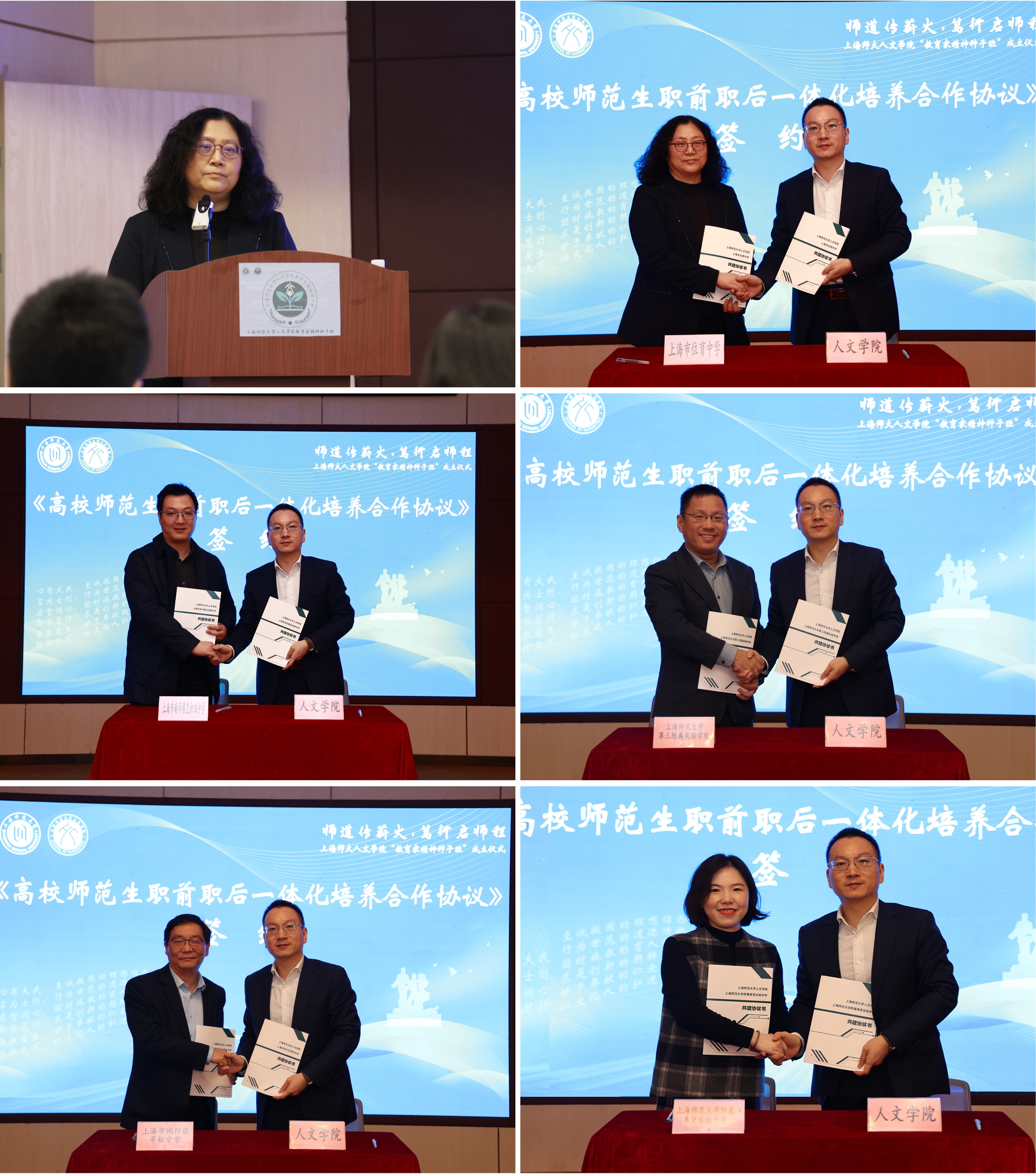 機制創(chuàng)新的關(guān)鍵在于“多元主體協(xié)同”。儀式上,人文學(xué)院與上海市位育中學(xué)、上海市南洋模范初級中學(xué)、上海師范大學(xué)第三附屬實驗學(xué)校、上海市閔行區(qū)莘松中學(xué)和上海師范大學(xué)附屬奉賢實驗中學(xué)等五所優(yōu)質(zhì)中小學(xué)現(xiàn)場簽署了首批“職前職后一體化培養(yǎng)合作協(xié)議”,協(xié)議中明確大中小學(xué)在職前培養(yǎng)目標中,共同提升師范生的教師情懷、理論素養(yǎng)、專業(yè)技能、實踐能力,實現(xiàn)從“新手”到“準優(yōu)秀教師”的轉(zhuǎn)變;在職后培養(yǎng)目標中,共同助力中小學(xué)在職教師更新教育理念、提升教學(xué)與研究能力,實現(xiàn)從“經(jīng)驗型”到“研究型”“專家型”教師的跨越,這標志著大學(xué)與中小學(xué)協(xié)同培養(yǎng)教師的“立交橋”正式貫通。人文學(xué)院中文系1986級校友、上海市位育中學(xué)校長王亦群在發(fā)言中表示,“這不僅是協(xié)議的簽署,更是責(zé)任與夢想的聯(lián)結(jié)。我們將從‘用人方’轉(zhuǎn)變?yōu)椤餐囵B(yǎng)方’,開放優(yōu)質(zhì)教育資源,與上師大共同探索教育家成長的早期培育規(guī)律?!?/p>
