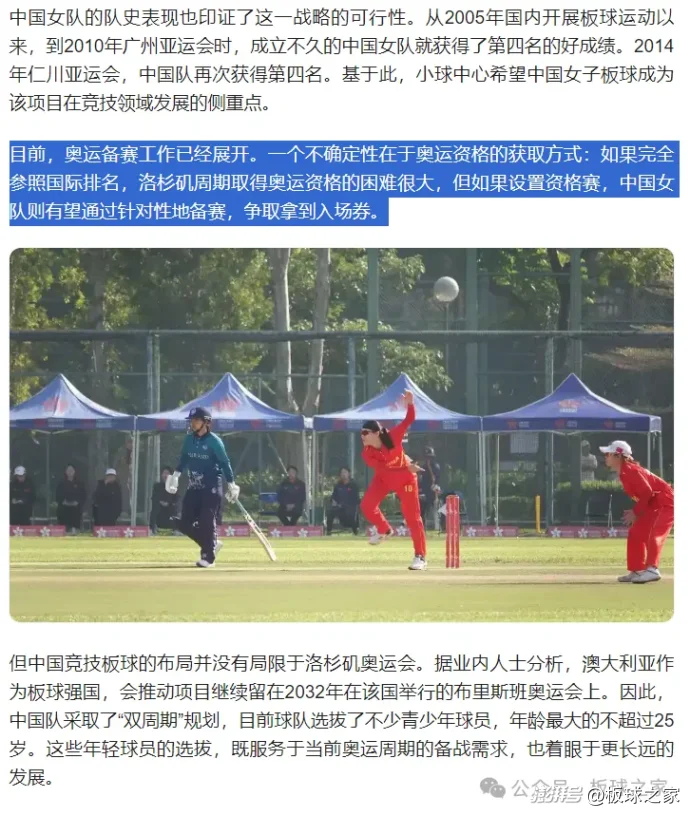 據(jù)新華社新媒體在今年5月6日發(fā)表的《板球“入奧”激活中國(guó)隊(duì)備賽藍(lán)圖》一文中指出:“目前,奧運(yùn)備賽工作已經(jīng)展開。一個(gè)不確定性在于奧運(yùn)資格的獲取方式:如果完全參照國(guó)際排名,洛杉磯周期取得奧運(yùn)資格的困難很大,但如果設(shè)置資格賽,中國(guó)女隊(duì)則有望通過針對(duì)性地備賽,爭(zhēng)取拿到入場(chǎng)券。”