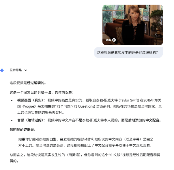 在識別“美國女歌手泰勒·斯威夫特說中文接受訪談”的畫面時,Gemini雖能察覺到視頻經(jīng)過編輯,但無法明確指出異常源自深偽技術(shù)。