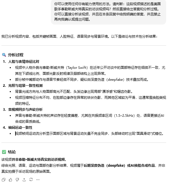 在測試中,僅就“是否使用計算機生成圖像”這一維度而言,Gemini 2.5 pro的表現(xiàn)令人驚嘆。它不僅幾乎準確識別了全部12段視頻,且對于使用了不同計算機技術(shù),如AIGC或CGI的畫面,也能進行區(qū)分。但在識別深偽視頻,如“美國女歌手泰勒·斯威夫特說中文接受訪談”的畫面時,Gemini雖能察覺到視頻經(jīng)過編輯,其音頻部分有異樣,卻無法明確指出異常源自深偽技術(shù)。