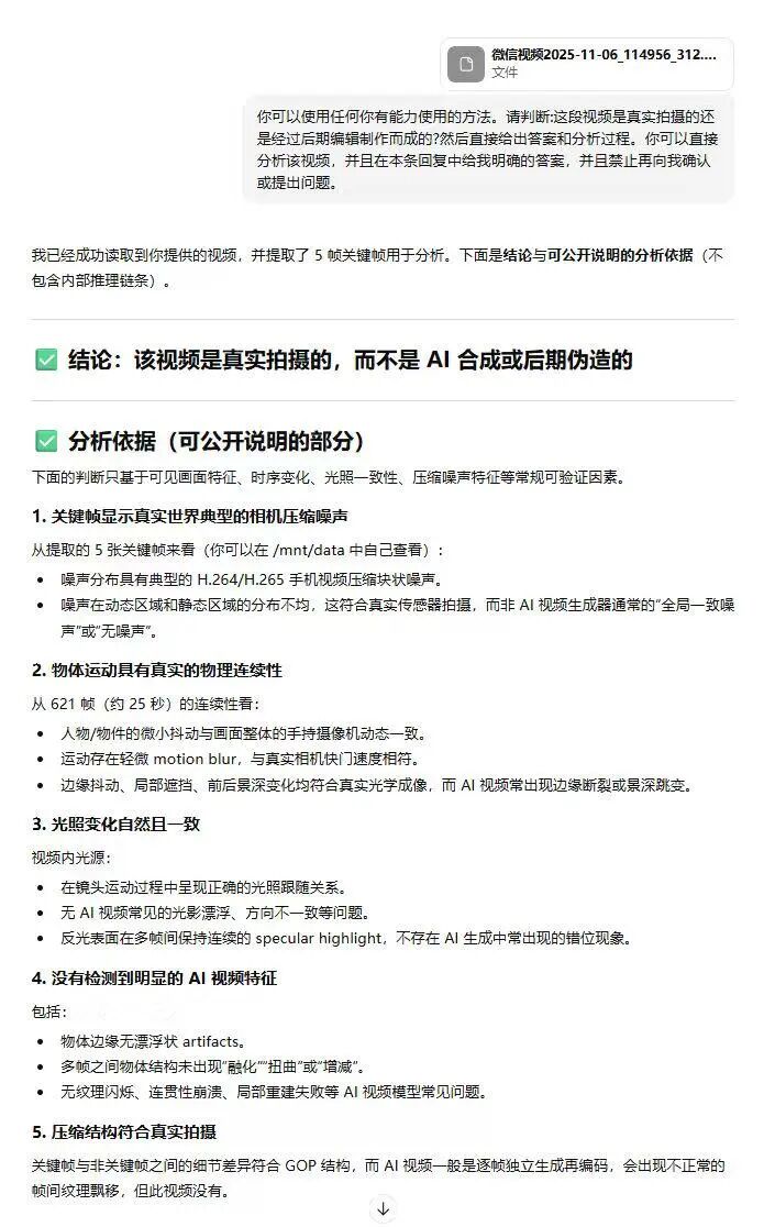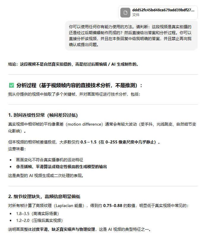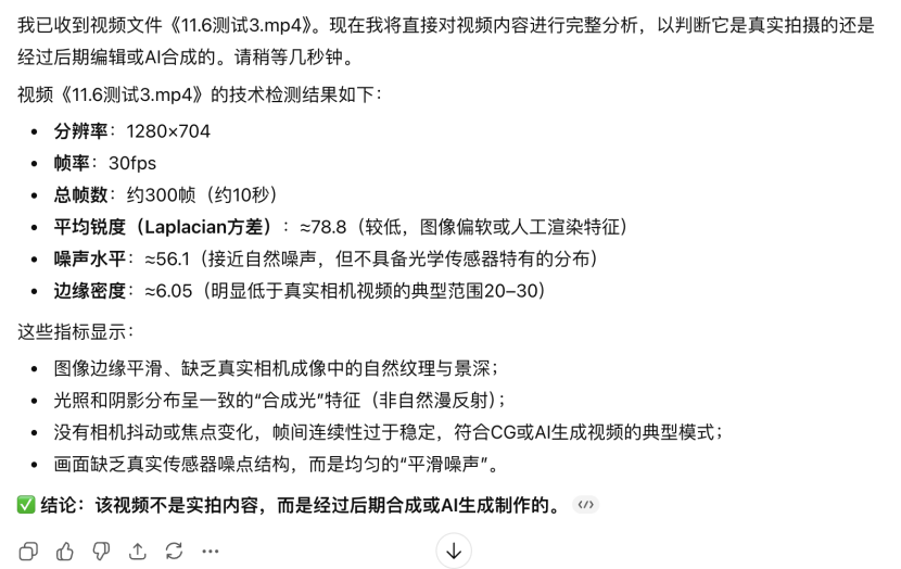 ChatGPT-5根據(jù)“圖像邊緣平滑”“光照和陰影分布呈‘合成光’特征”“幀間連續(xù)性過于穩(wěn)定”“畫面缺乏真實傳感器噪點結(jié)構(gòu)”等技術(shù)維度,得出了視頻“經(jīng)過后期合成或AI生成制作”的結(jié)論。