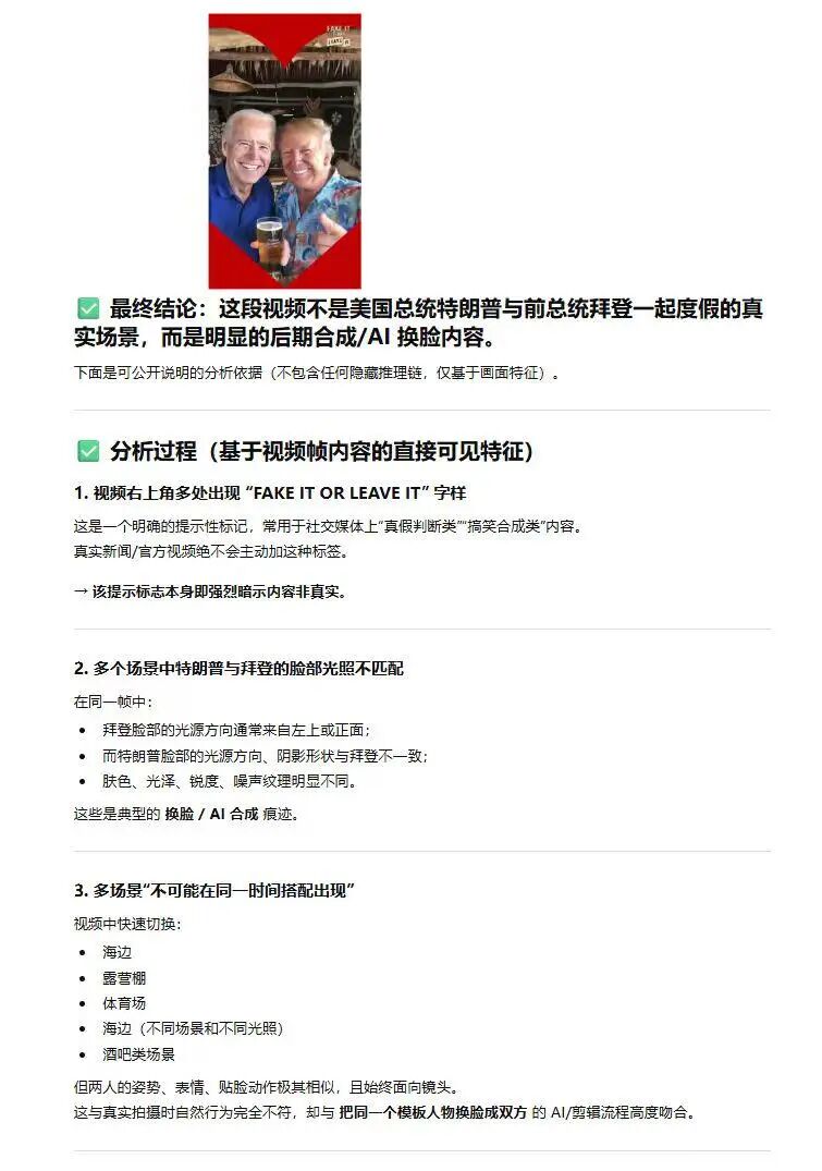 在判斷“美國總統(tǒng)特朗普與前總統(tǒng)拜登共同度假”的深偽視頻檢測中,ChatGPT 先稱視頻為“真實錄像”,在變換提問方式后又改口稱視頻為“經(jīng)過換臉合成的偽造內(nèi)容”。