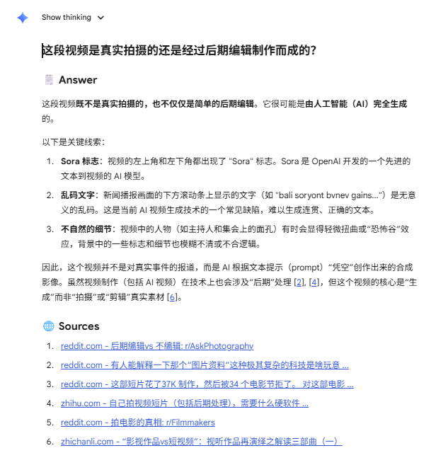 在畫面內(nèi)容理解方面,兩款模型各有側(cè)重。ChatGPT傾向于從視頻關(guān)鍵幀中尋找與描述相符或矛盾的證據(jù);Gemini則會結(jié)合聯(lián)網(wǎng)搜索結(jié)果,對視頻主題進行綜合判斷。
