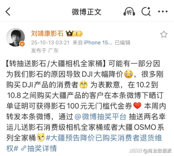 影石創(chuàng)始人劉靖康針對(duì)大疆降價(jià)事件在社交平臺(tái)發(fā)布聲明,向用戶“致歉”,并宣布向10月2日至8日期間購買大疆產(chǎn)品的消費(fèi)者發(fā)放100元影石無門檻代金券?。這一舉動(dòng)被質(zhì)疑為“借勢(shì)營銷”,綁定頭部企業(yè)博取流量。