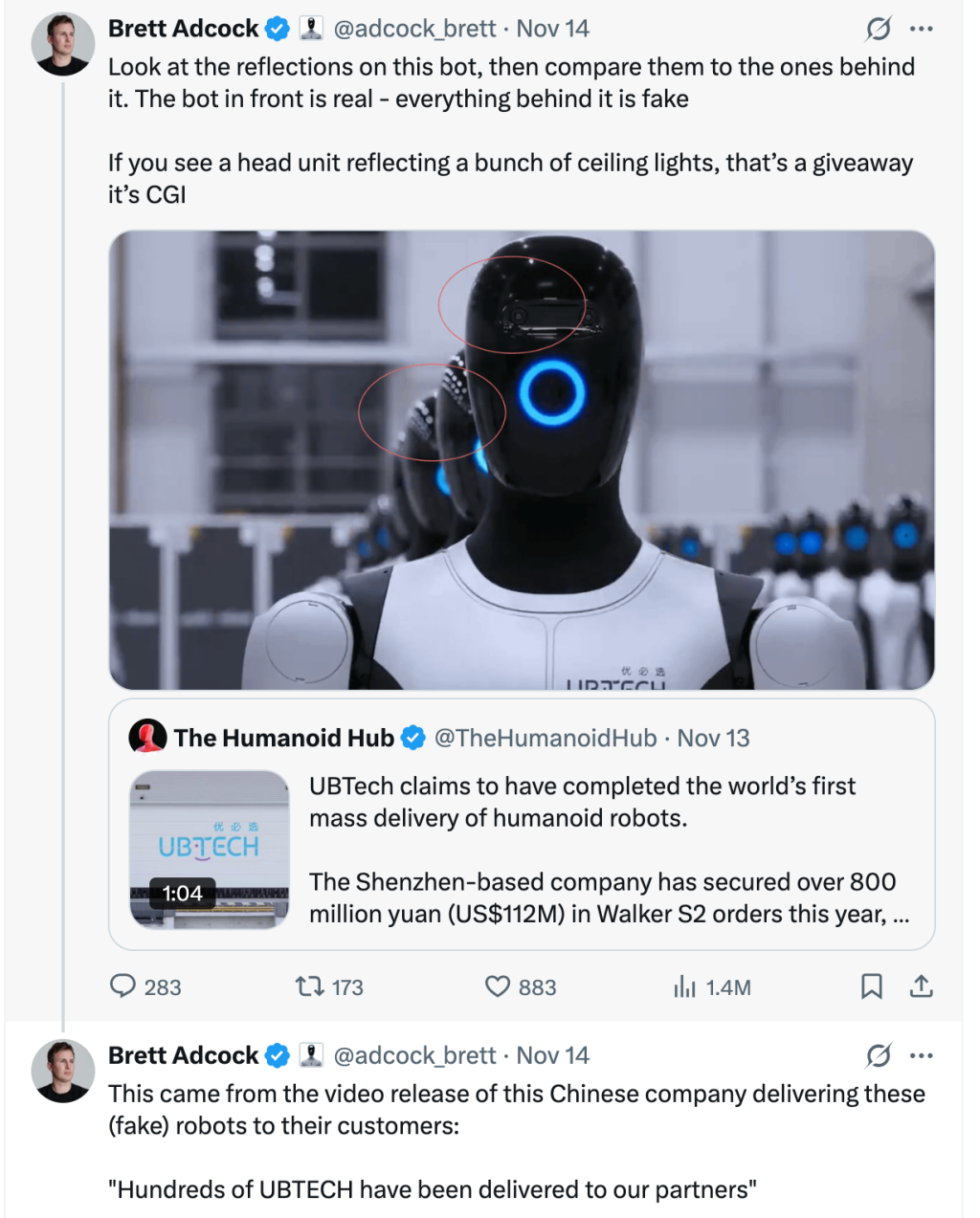此前,優(yōu)必選發(fā)布了工業(yè)人形機(jī)器人Walker S2量產(chǎn)交付視頻。Figure創(chuàng)始人布雷特·愛德考克(Brett Adcock)在社交平臺(tái)公開質(zhì)疑視頻中是“fake robots”,大概率是電腦特效制作。