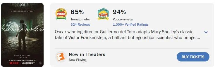 △ 《弗蘭肯斯坦》爛番茄的新鮮度為85%,爆米花指數(shù)94%