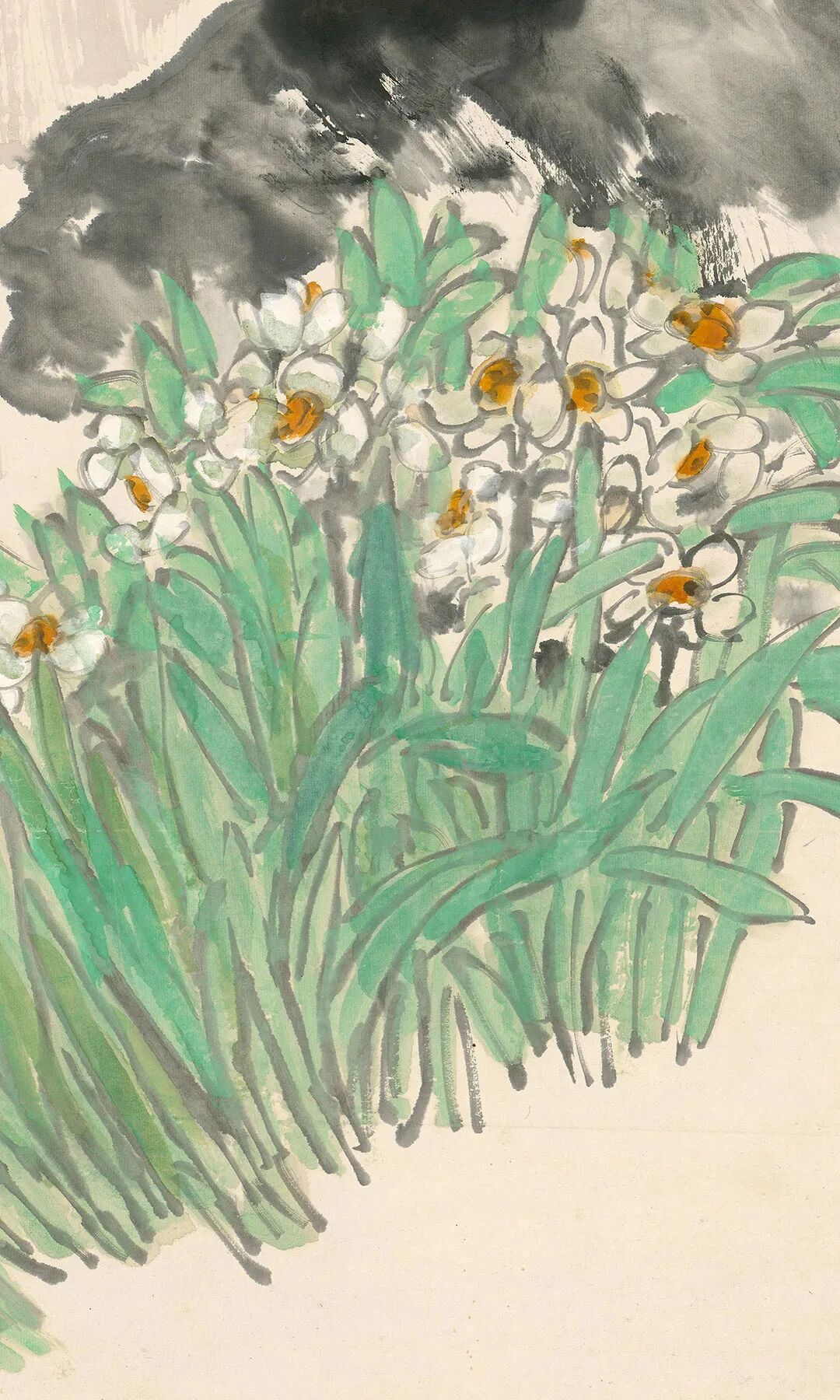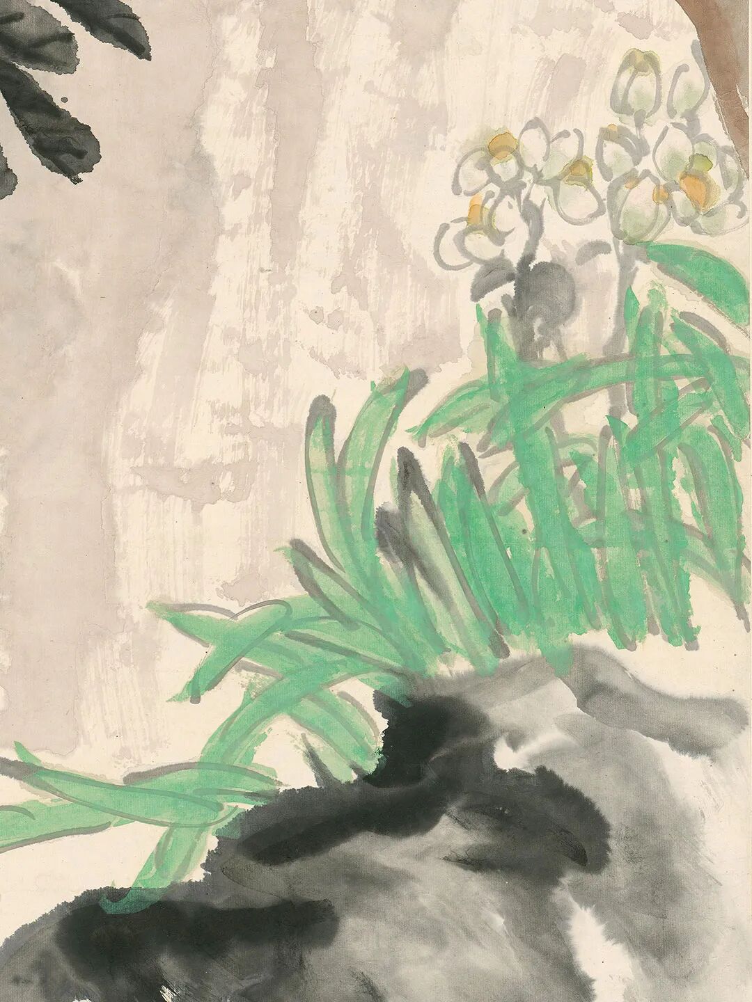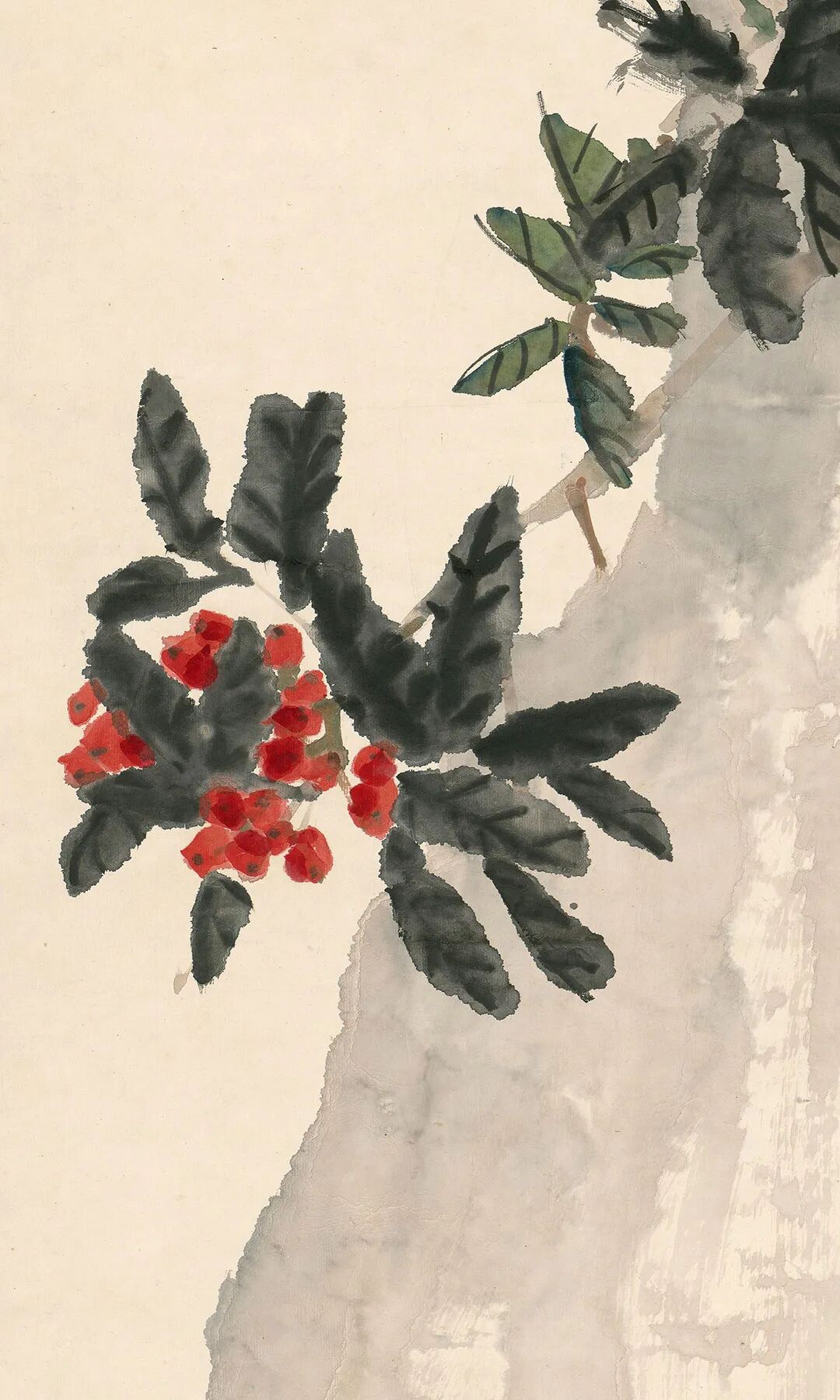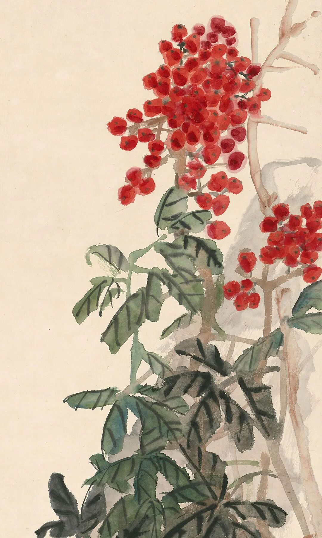 此圖又名《群仙祝壽》。圖繪天竺、水仙。構(gòu)圖頗具匠心,水仙順坡生長取斜勢,而參差錯落的天竺直、斜之姿兼?zhèn)洌巩嬅娓挥谧兓?,情趣盎然。水仙的葉片以墨筆勾線,石綠填色,濃厚的色彩增添了鮮活的生機(jī);高挑的天竺則以寫實(shí)手法點(diǎn)染而成,其艷麗的嫣紅色與水仙的綠色形成冷暖色調(diào)的對比,色彩明亮卻不俗艷。