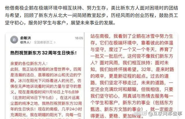 人們發(fā)現(xiàn),在這封信里俞敏洪共提到了17次“我”、5“次”南極,但卻對(duì)員工們的工作壓力鮮有提及。