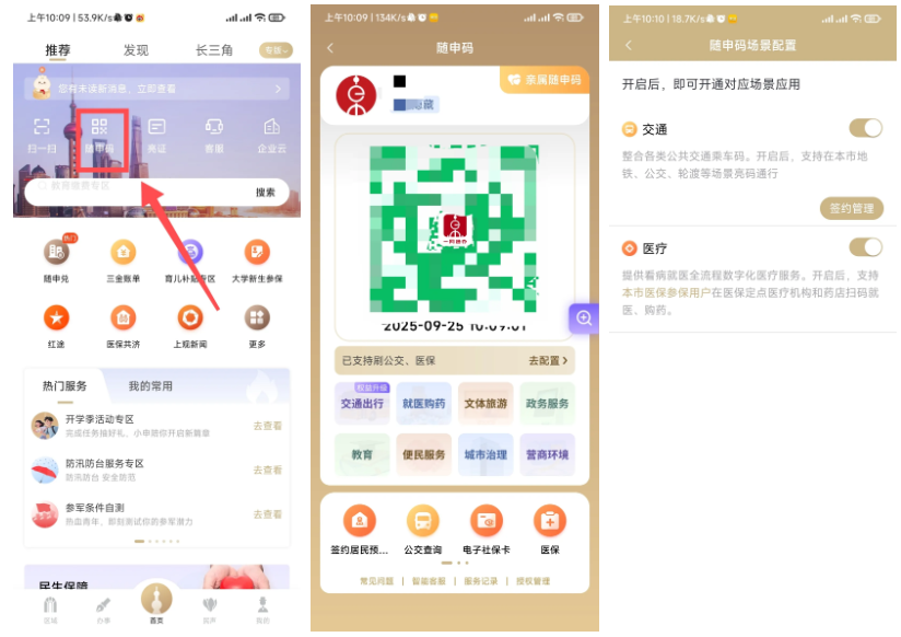 打開“隨申辦市民云”APP,點擊首頁“隨申碼”完成“隨申碼”交通場景配置,全市公交、地鐵、輪渡一碼暢行~