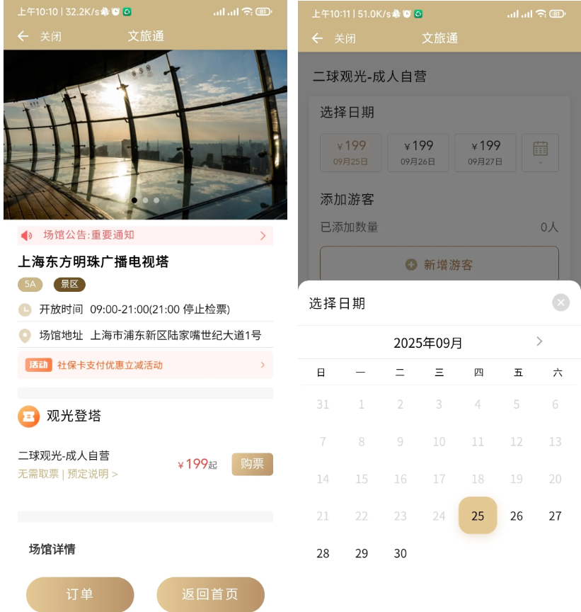 在景點詳情頁點擊“購票”,進入購票頁面選擇參觀日期,然后點擊“新增游客”選項,輸入游客信息后,即可完成購票。