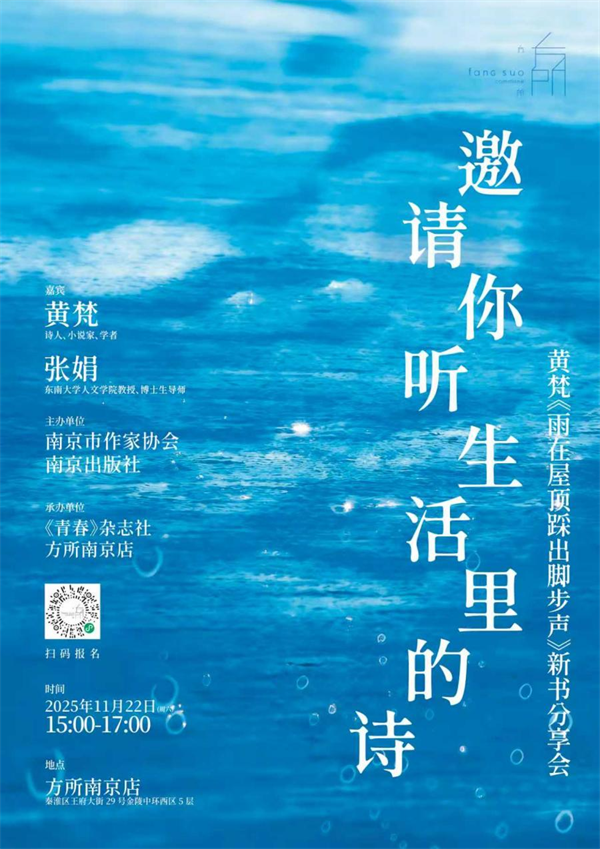 黃梵新詩集《雨在屋頂踩出腳步聲》以“連通詩與生活”為核心,展現(xiàn)“萬物皆可入詩”的創(chuàng)作理念。11月22日,我們特邀黃梵與學(xué)者張娟展開對(duì)談。兩位老師將圍繞“詩與生活”這一主題,分享如何捕捉生活詩意,解讀現(xiàn)代詩中蘊(yùn)含的細(xì)膩故事,為讀者呈現(xiàn)一場深刻的精神對(duì)話。