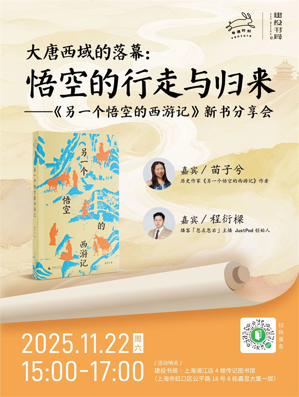 提到“悟空”,你是否只想到大鬧天宮、西天取經(jīng)的孫行者?但歷史的塵埃里,藏著另一位真實(shí)的“悟空”——俗名車奉朝的大唐武官。11月22日下午,《另一個(gè)悟空的西游記》作者苗子兮,將與知名播客“忽左忽右”主播程衍樑齊聚建投書局,帶你循著真實(shí)悟空的腳步,一起聊聊歷史與傳說的交織,探尋大唐西域落幕的深層密碼,看個(gè)人命運(yùn)在時(shí)代洪流中掙扎、堅(jiān)守與回響。