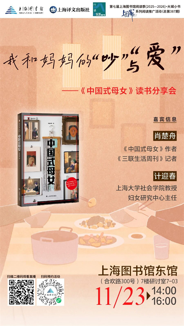 母愛是一種天性嗎,是否需要學(xué)習(xí)?母職,是一種被天生賦予的使命,不可回避,還是一種個(gè)人選擇?《中國式母女》寫盡了中國母女之間那些說不出的復(fù)雜情感。11月23日,我們邀請(qǐng)到《中國式母女》作者肖楚舟與上海大學(xué)社會(huì)學(xué)院教授、婦女研究中心主任計(jì)迎春博士來到上海圖書館東館,與大家探討我們與媽媽之間那些復(fù)雜又糾纏的關(guān)系。